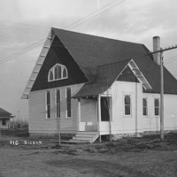 - Wood frame church; another house and outbuilding are visible.