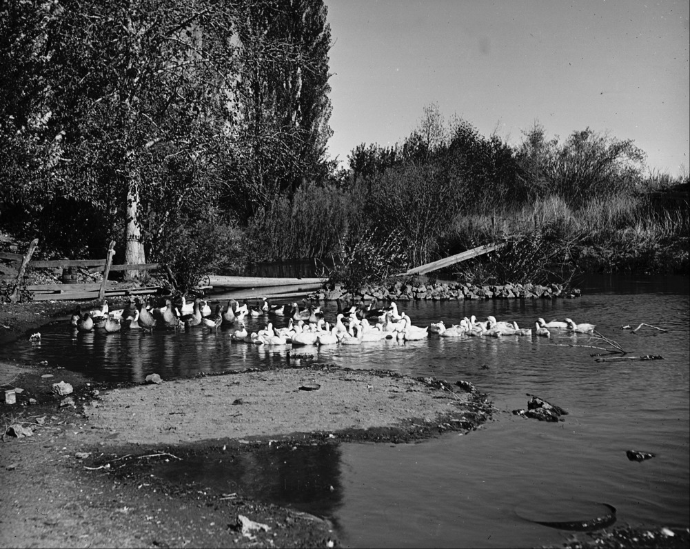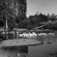 Ducks float on a pond.