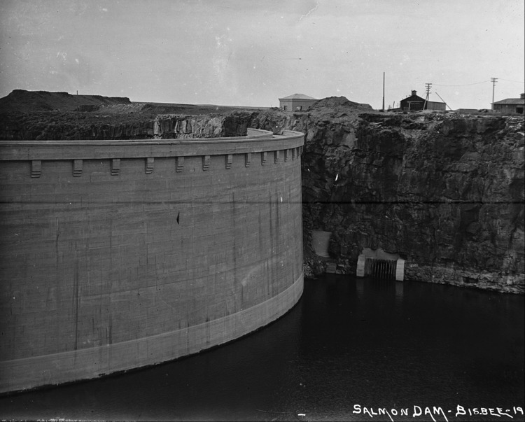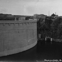 "Salmon Dam;" showing the reservoir side; buildings in background.