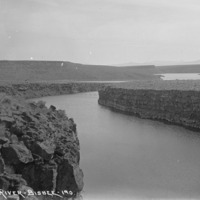 - "Salmon River;" long view of Salmon Falls Creek; a bridge connects the banks of the canyon in the center of the image.