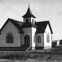 - Wood frame church; other houses and outbuildings are visible in the background.