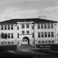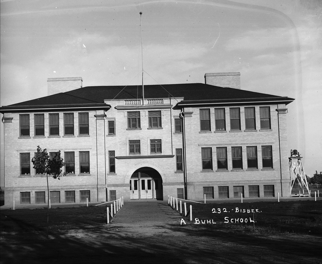"A Buhl School;" two-story brick and stone schoolhouse in Buhl ; a large bell on a wooden platform is on the side of the school.