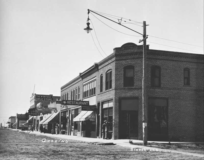 - "Gooding;" view of one side of Main Street in Gooding. Businesses and buildings visible include: The Toggery; Light and Power; The McIntosh Drug Store; Byers's Bakery and Café Confectionery; Star Restaurant; Madeline Hotel. A man and woman peer into one of the windows of the corner building.