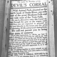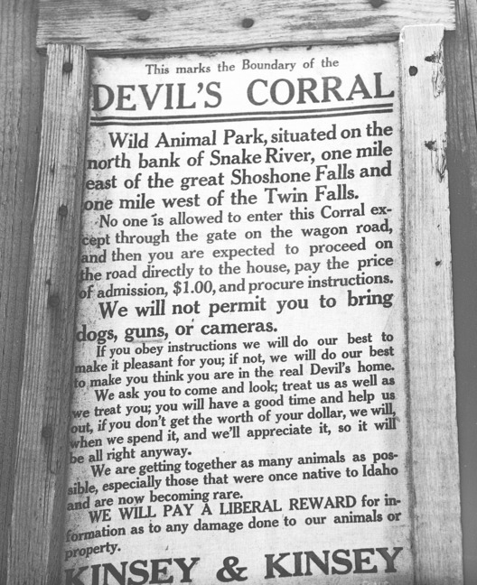 The sign reads, "This marks the Boundary of Devil's Corral, Wild Animal Park, situated on the north bank of Snake River, one mile east of the great Shoshone Falls and one mile west of the Twin Falls.