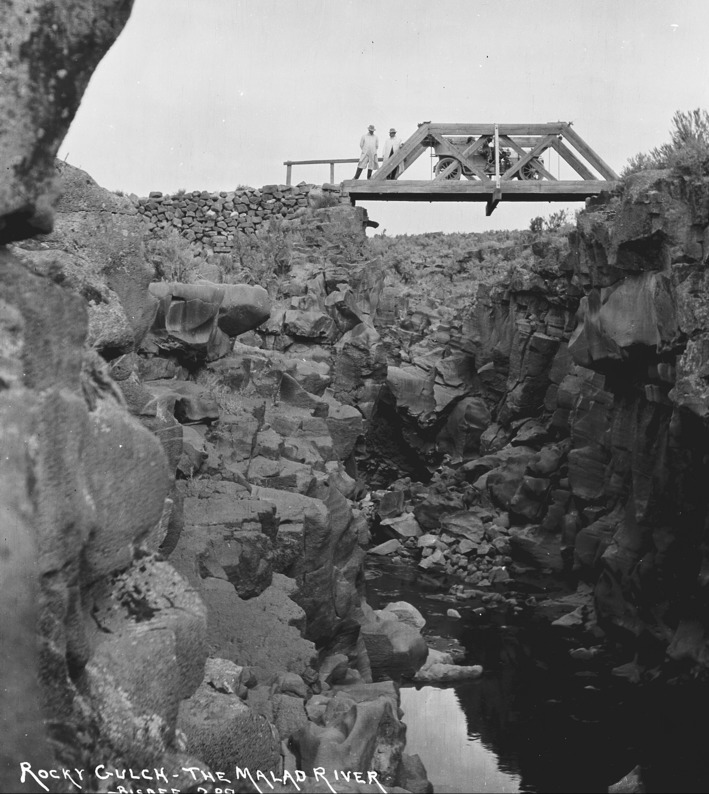 - "Rocky Gulch - Malad River;" two men in light duster coats stand behind an automobile (car) on a wood bridge spanning a narrow chasm.