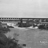 "American Falls;" view of power plant buildings and bridge above dam.
