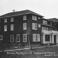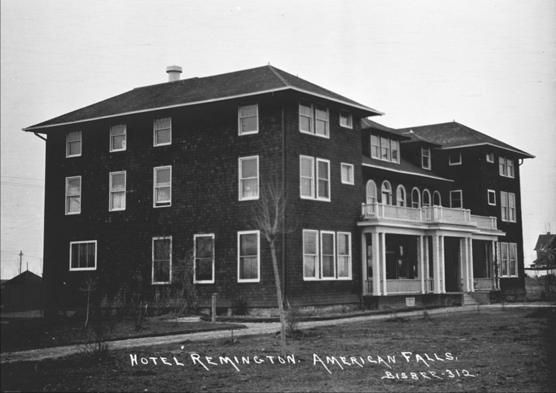 "Hotel Remington. American Falls;"three-story brick hotel with a balcony over a colonnade front porch.