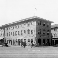 Corner view of the Hotel Perrine, showing the Shoshons St side; people and automobiles (car) are visible, along with the following businesses: Perrine Hotel Cigar Store; Abstacts and City Loans; Rexall Drug Store;