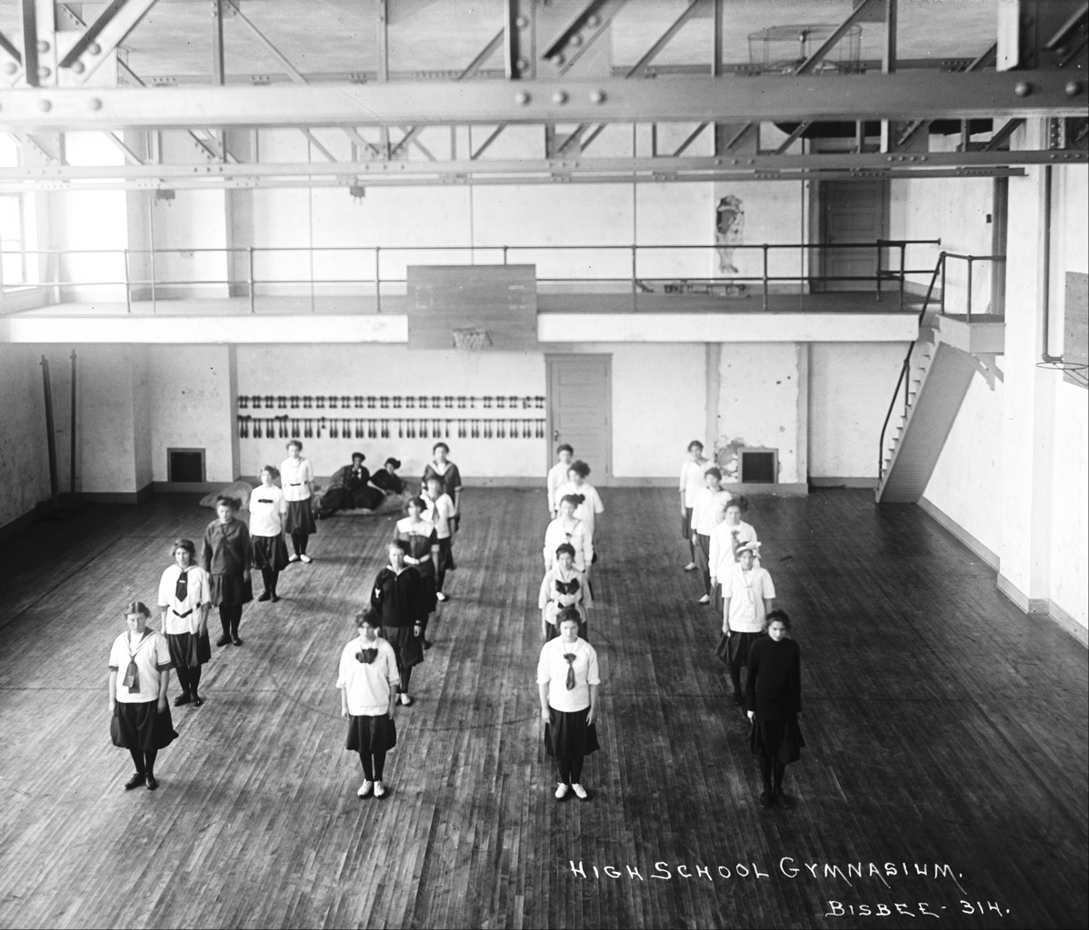 - "High School Gymnasium;" Twin Falls High School students in formation on the gymnasium floor, a couple sit on the floor in the back; staircase and mezzanine can be seen; basketball hoop and weights also visible