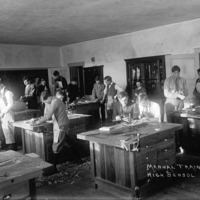 - "Manual Training. High School;" students working with saws, other carpentry tools in Twin Falls High School classroom.