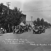 - "Automobile Parade. In 1913, Twin Falls claims 160 Automobiles;" parade on Shoshone Street, Twin Falls County Court House in background; automobiles (cars) carrying band and musical instruments have signs with "Member of Twin Falls Commercial Club; also visible is the Lyric Theater.