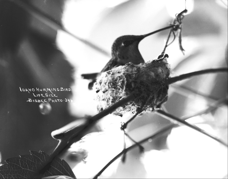 - "Idaho Hummingbird - Lifesize;" bird in its nest.