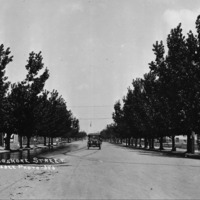 - "Shoshone Street;' an automobile (car) drives down the center of the street lined with trees.The Methodist Church can be seen beneth the treeline on the right.