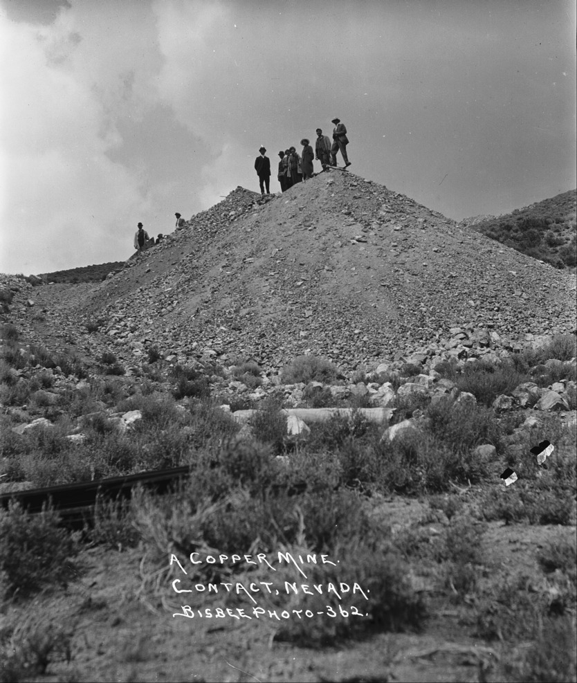 - "A Copper Mine, Contact, Nevada;" several men stand on top of a large pile of mine tailings