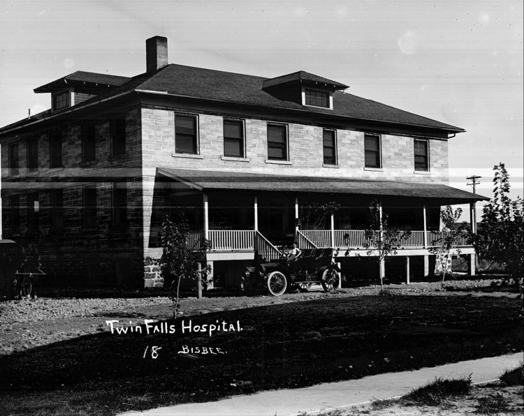 - Twin Falls Hospital; large brick building with a wide front porch area; an automobile (car) is parked in front and a buggy and horses are at the side. This building was enlarged from the original building.