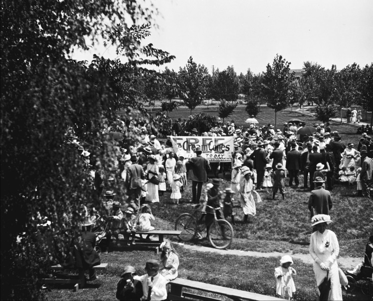 A crowd of people in City Park gathered around a with a sign that reads, " Free Ice Cream Cones;"