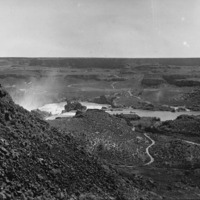 - A wide view of the Snake River Canyon above Shoshone Falls, looking north.