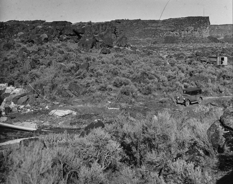 - An automobile (car) and camp trailer in the bottom of the Snake River canyon.