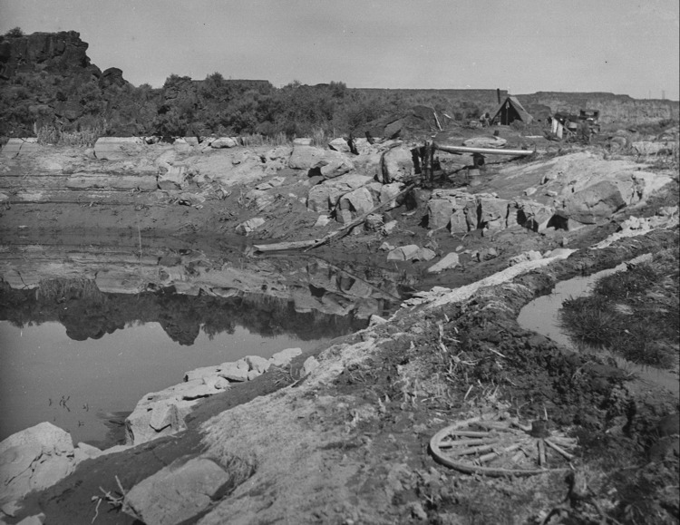 - A pumping station in the Snake River Canyon; tent, automobiles (cars), and people in the background. An old wagon wheel is half-buried in the foregreound.