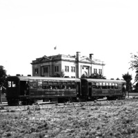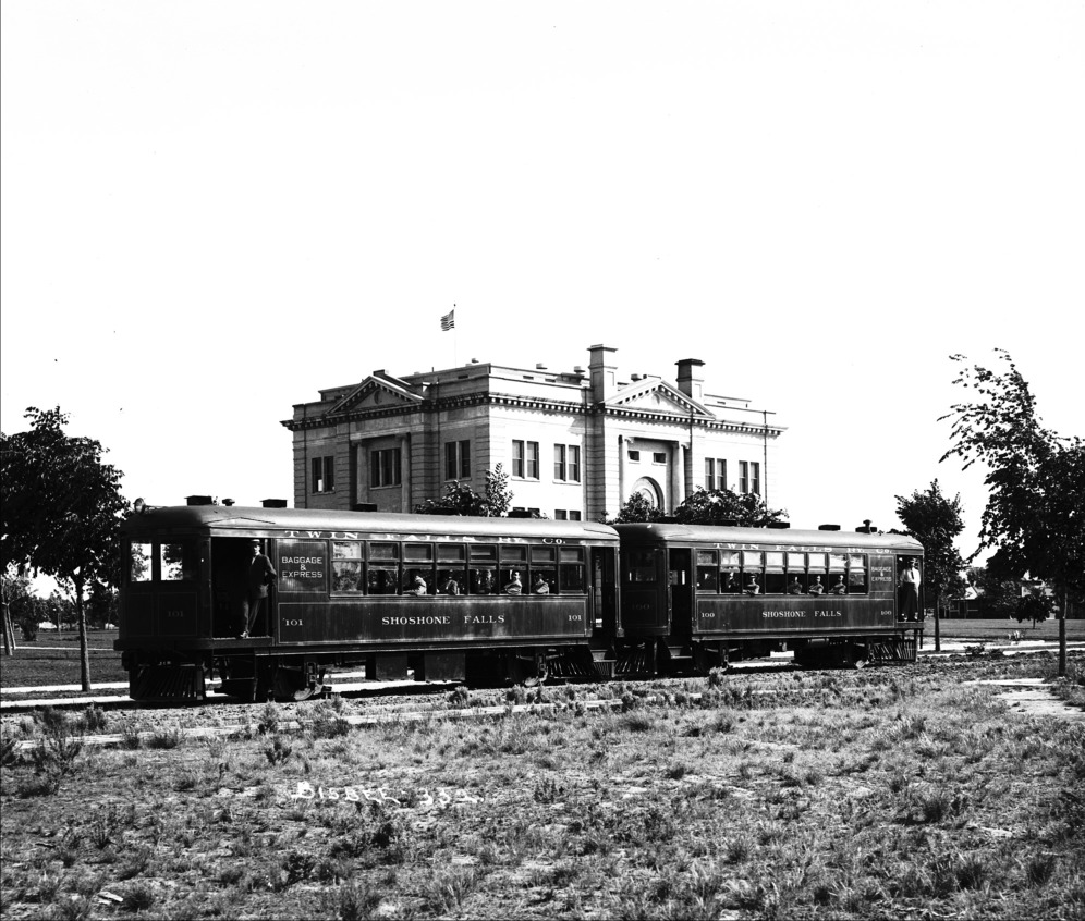 The Twin Falls Electric Railway cars parked behind the Court House. Several people pose leaning out the windows.