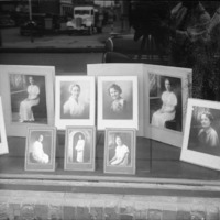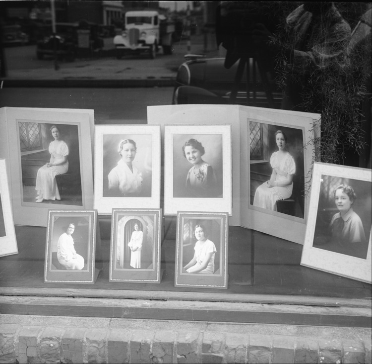 - Window display of studio portraits of women, likely at the Bisbee Studio. Window reflection shows a truck and automobile (car).