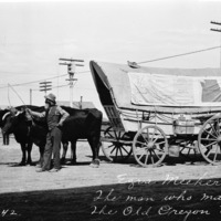 - "Ezra Meeker, The Man Who Marked the Old Oregon Trail;" Ezra Meeker stands by the two oxen pulling a covered wagon during his 1906 journey east on the Trail. The wagon has a map pinned to it depicting the route of the Oregon Trail.