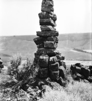 PC-2255 "The Bryan Monument;" tall pile of rocks (cairn) on the edge of the canyon overlooking the Perrine Ranch. {Was built while William Jennings Bryan was visiting Perrine while campaigning for President.}
