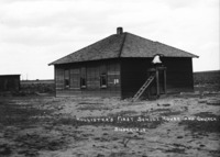 PC-2260 "Hollister's First School House and Church;" a one-story wooden frame building. A bell on a platform is at the rear, with a ladder leading to the top. A smaller outbuilding is on left.