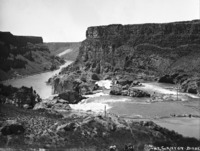 PC-2169 "Bridal Veil;" one of the three falls that make up greater Shoshone Falls. A woman stands on the dam above the Falls and two people stand o the cliff at the left.