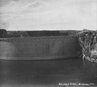 PC-2176 "Salmon Dam;" view of the dam from the west canyon wall, with construction buildings on the far side.