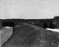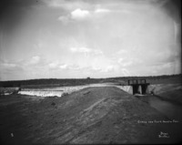 B 102 "Head Gates at Wilson's Lake;" view along berm beside gates of North Side; a man stand at the gates; a building in background at right