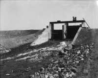 B 099 "Headgates at Wilson Lake, North Side;" a man stands at the gates