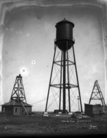 B 103 "Water Tank. Jerome, Idaho;" water tank among other buildings; a man stand at the top of a structure on one of the buildings