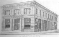 339 B Twin Falls Bank and Trust Company Building; corner of Main Avenue and Shoshone Street; Also visible: George Herriott, Attorney at Law; Roberts Daly Company, Orchard Lands; Mark M. Murtaugh Consulting, Hydraulic and Construction Engineer; Straus Glauber Clothing (building next door on Shoshone); Dr. McAtee, Dentist (building next door on Main); photo engraved from 339