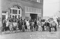 PC-2065 "Starting for Jarbidge;" men and boys alongside a mule train in Twin Falls, outside the Rogerson Hotel, Avant House in background.
