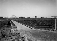 1893 The bridge over Rock Creek, at the west end of Shoshone Street, from the west; with the Oregon Short Line Railroad Depot and other buildings in the distance. (Singing Bridge).