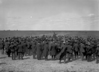 1891 A large group of men gathered around a speaker in a field; horses and/or cattle and a townsite in the distance.