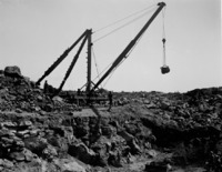 1898 Men operating a large derrick crane; lifting rock from a canal channel.