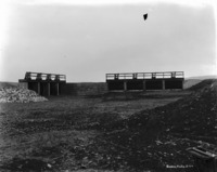 S 029 A man in a two-horse buggy stops on a berm beside canal gates. The canal bed is dry.