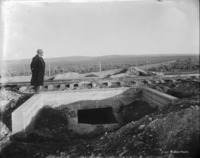 S 023 A man stands looking across a canal siphon and railroad tracks.