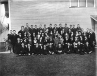1819 Large group of mostly young people posed in front of the original First Christian Church.
