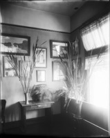 1697 Interior of Bisbee Studio. Cattails in vases, framed photos visible.