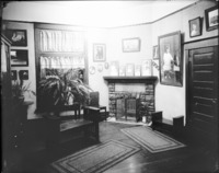 1705 Interior view of the Bisbee Studio. Fireplace and framed photographs visible.