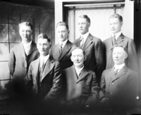 1689 Portrait of seven men of varying ages, all dressed in suits.