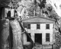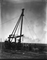 1617 Five men, a woman, and a girl seated in a cart pulled by a goat standing near a drilling rig at the first well in Twin Falls County, credited to P. B. Johnson.