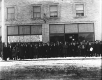 1609 A group of men gathered in front of the Addison T. Smith building in the snow. A sign in the window reads: State Dairy Convention, Monday & Tuesday, January 23-24; Addison T. Smith Building, Shoshone St & 3rd Ave W, First Lecture Mon 10 AM; Movable Agricultural School, Week January 23-28.