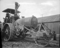 1603 "Traction starting from Twin Falls to Salmon River Dam; October 8, 1908;"steam tractor; tractor reads, "The Best Manufacturing Company; San Leandro, Ca; " Number 237. One man posed on the tractor.