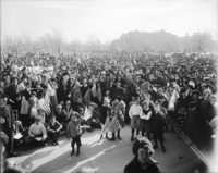1615 Armistice Day, November 11, 1918; a large crowd of people in front of the county court house celebrating the end to World War I. Methodist Church is in the background.