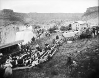 1616 People sitting on benches in front of the grandstand at Shoshone Falls on Flag Day, June 17th, 1910; Ezra Meeker with oxen and wagon at right.