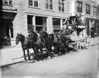 1610 A stagecoach loaded with men in front of the Perrine Hotel A woman is seated inside.